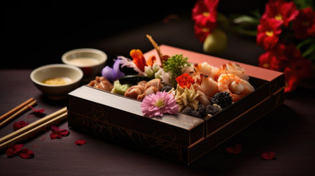 Experience a luxurious Japanese meal spread featuring fresh sushi, vibrant vegetables, and beautiful floral arrangements, perfect for any dining occasion.