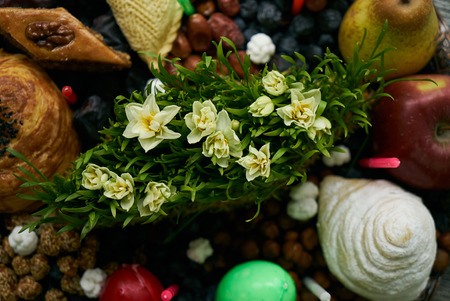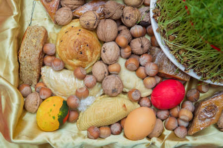 Traditional shekerbura, eggs , mutaki and pakhlava as Novruz symbol on xoncha on white background Azerbaijan holiday . Semeni . Candle . khoncha . In hell, hazelnuts, gooseberries, walnut .