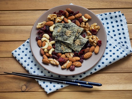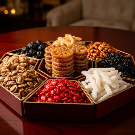 Cropped image of glazed raisin, dried green berries and watermelon seeds on Tet fruit tray