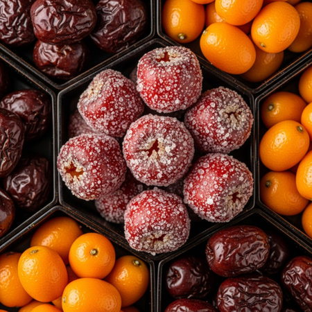 A striking arrangement of colorful sweetmeats for a special occasion, showcasing the artistry involved in their creation.