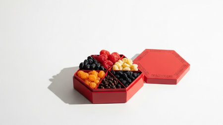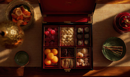 Luxurious festive food assortment in ornate red box, perfect for celebrations and gourmet dining experiences