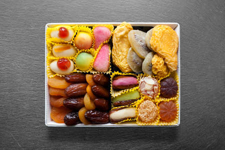 Arabic sweets boxes.Top view showing several shapes and types of traditional sweets