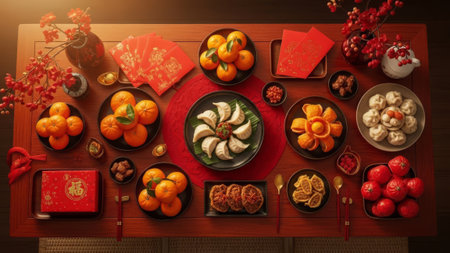Chinese New Year food spread, oranges, dumplings, red envelopes