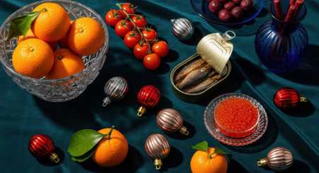 A vibrant overhead shot of a holiday table spread featuring a bowl of fresh oranges, ripe cherry tomatoes, an open can of sardines, and a dish of red caviar, all adorned with festive Christmas ornaments on a deep teal tablecloth.