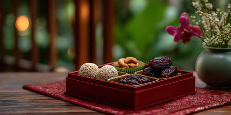 Red gift box with compartments filled with dates, nuts, and sesame balls on wooden table with flower vase