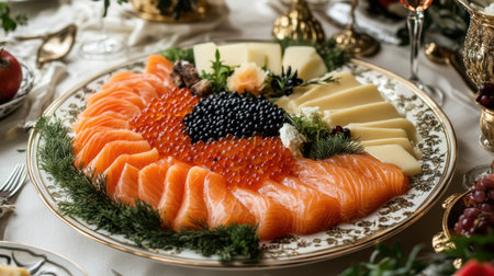 A tasteful arrangement of salmon, caviar, and cheese, complete with elegant garnishes and serving utensils.