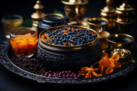 A cozy wooden tray displays an inviting assortment of herbal tea, crunchy cookies, assorted nuts, and fragrant dried flowers, symbolizing relaxation and wellness.
