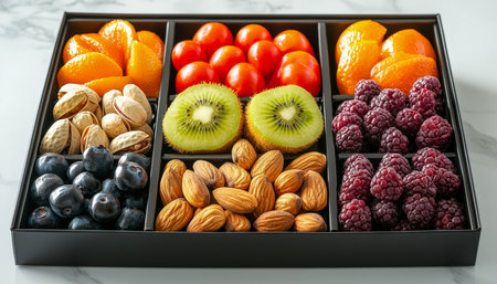 An elegant assortment of vibrant fruits, crunchy nuts, and colorful delights arranged in a sleek black gift box, perfect for gifting or gourmet display