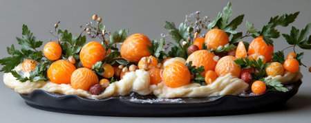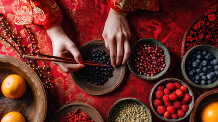 A beautifully arranged scene of fresh fruits and colorful ingredients set against a rich red background, showcasing the festive spirit of celebration and tradition.