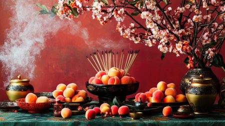 A Chinese New Year altar adorned with fresh peach blossoms, incense sticks, and symbolic fruits for good luck