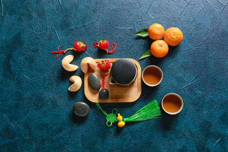 Chinese festive table asian food flat lay view. Lunar new years. Chinese New Year. Asian festive food