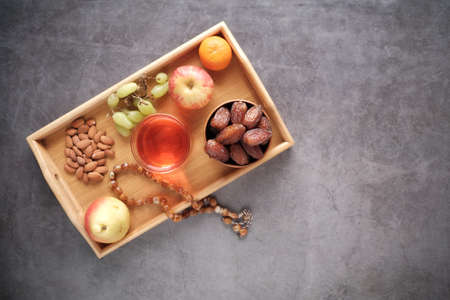 Top view on table setting with colourful Ramadan halal food. Generative AI.