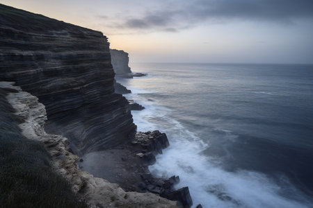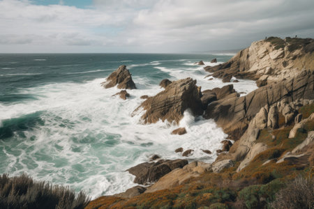 coastal cliff with jagged rocks, crashing waves, and serene sky, created with generative ai