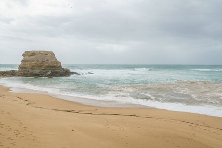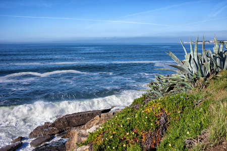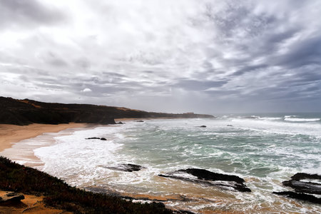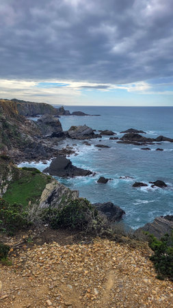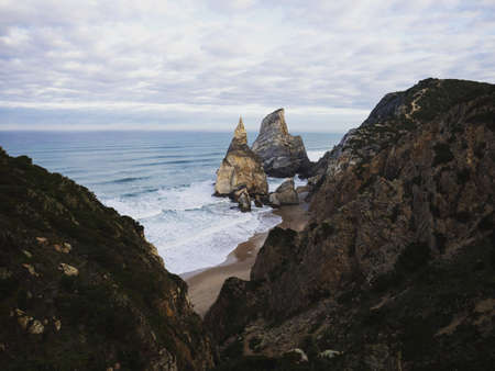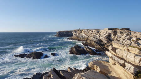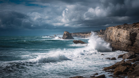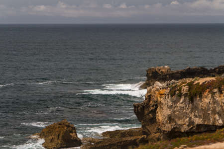 Beautiful landscape of rugged coastline with waves crashing against the cliffs. View of seascape coast and Atlantic ocean waves in a north winds days in Portugal.