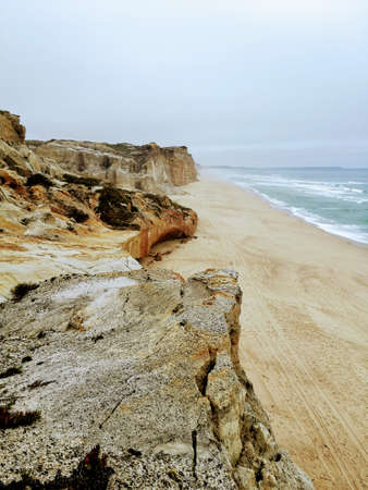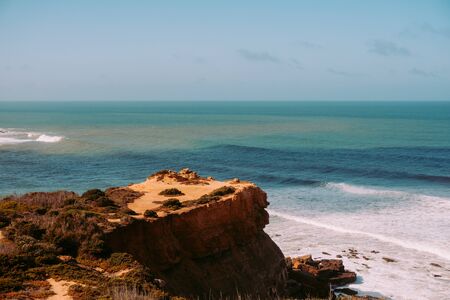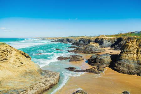 View on Praia de Odeceixe-Mar with White Waves on Blue Sky background Outdoors. Region Algarve, Portugal