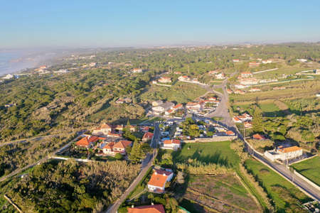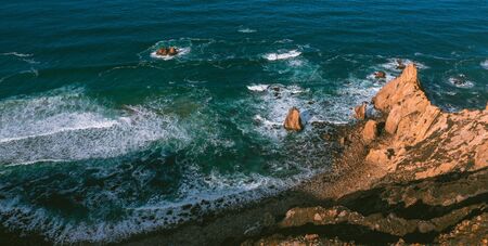 Aerial view on Atlantic coast with rock cliffs and waves at sunset in Portugal