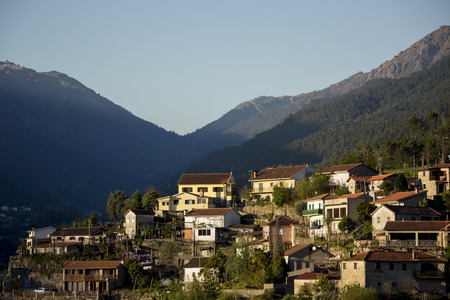 Pretty two-story house next to a road passing through countryside landscape, in a sunny day at Lageosa do Mondego. A nice little village in the countryside, at mountain foothills on eastern Portugal.