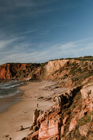 Delightful panoramic view of the Portuguese beach of the village of Odeceixe with tourists in summer. High quality photo