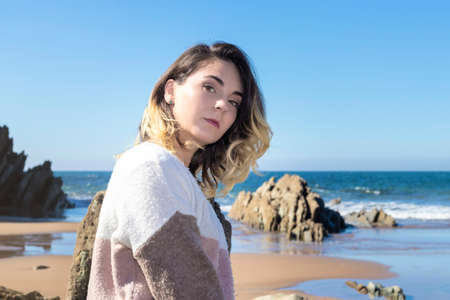Sport girl and a woman on the shore of the Atlantic Ocean of Portugal, sitting on a stone and talking and thinking about life.