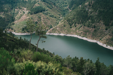 Blue fresh water at dam lake on hilly landscape covered by rocks and brushwood, on the highlands at the Serra da Estrela. The highest mountain range in continental Portugal, with astonishing scenery.