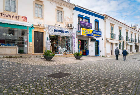 Silves, Portugal - January 23, 2020: Narrow cobblestone streets, with residental homes and bistros in the Algarve village of Silves