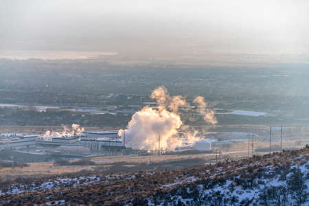 Industrial plant emitting steam against a snow covered landscape in winter. Houses and lake can also be seen in the foggy background.