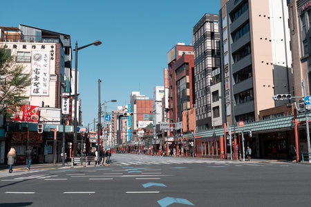 TOKYO, JAPAN - APRIL 9, 2023: View of street in Taito kaminarimaon area in daytime