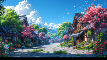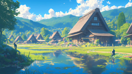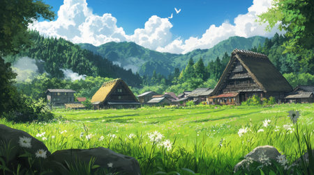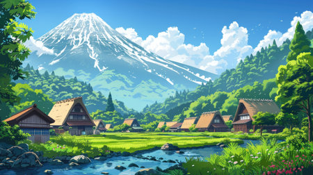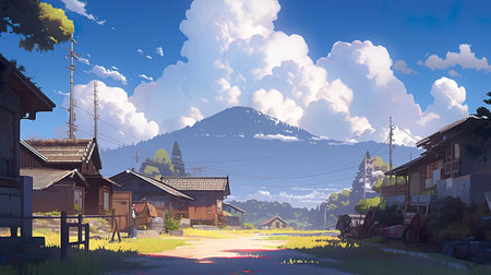 Anime style rural village and mountain landscape, perfect for tranquil nature backgrounds.
