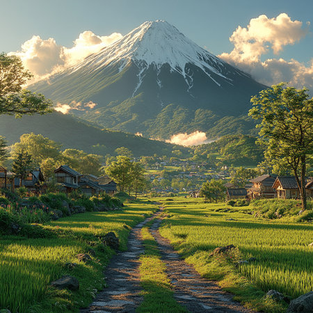 Hyper-realistic 3D Mount Fuji, glowing with golden autumn hues in the valley below.