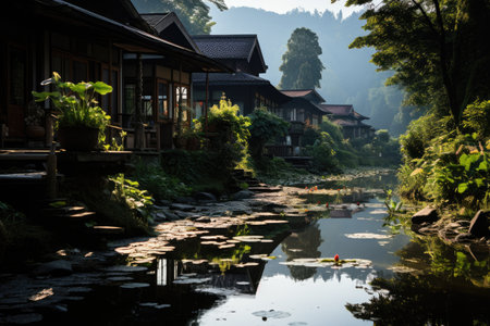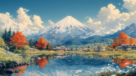Illustration of a traditional Japanese village in rural landscape setting surrounded by red trees in Kyoto. Wooden huts and a stream of water in foreground in the style of anime cartoons. Pastoral art
