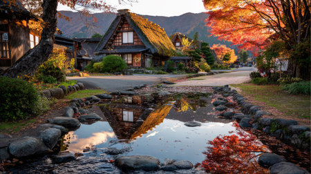 A tranquil view of a traditional village surrounded by mountains, showcasing beautiful autumn leaves reflected in a calm pond, perfect for nature lovers.
