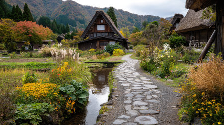 Explore a picturesque traditional village with a stone pathway surrounded by vibrant autumn foliage, showcasing a harmonious blend of rustic architecture and nature.