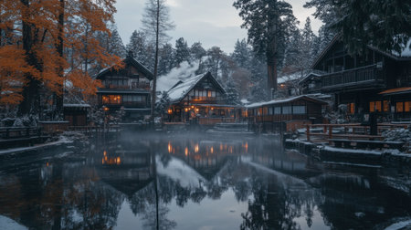A tranquil winter retreat featuring rustic cabins by a frozen lake, surrounded by mist and snow-covered trees, creating a serene and peaceful atmosphere.