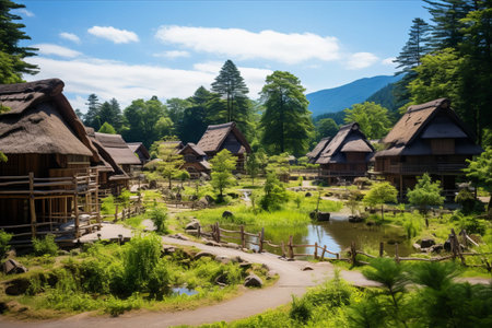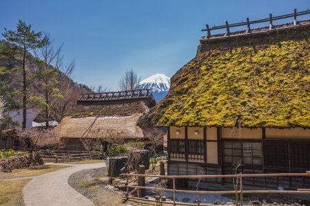 Traditional Japanese thatched-roof houses in a village with Mount Fuji in the background. A picturesque scene showcasing Japanese architecture and natural beauty.