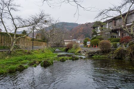 Oshino, Japan - Jan 13 2020 : Japan with Mt. Fuji in the background. Oshino Hakkai is a small village in a scenic setting with 8 ponds.