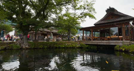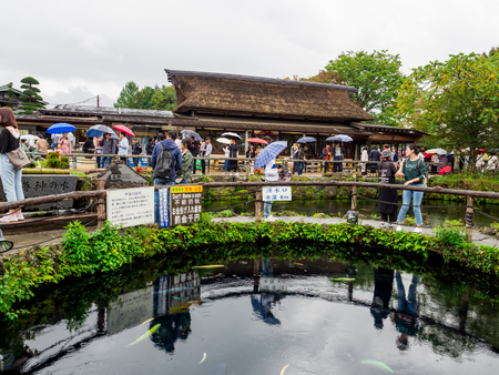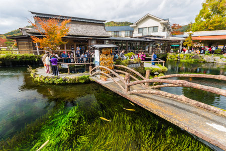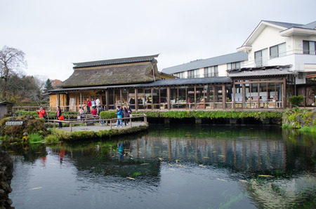 Oshino, Japan - October 26, 2014:Tourists visit Oshino Hakkai, a small village in the Fuji Five Lake region, located between Lake Kawaguchiko and Lake Yamanakako.