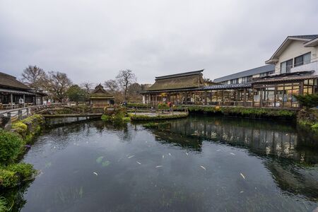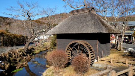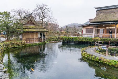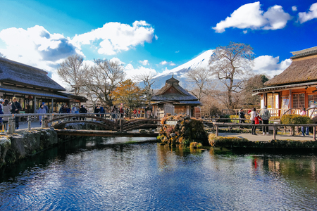 Oshino, Japan - Jan 13 2020 : Japan with Mt. Fuji in the background. Oshino Hakkai is a small village in a scenic setting with 8 ponds.