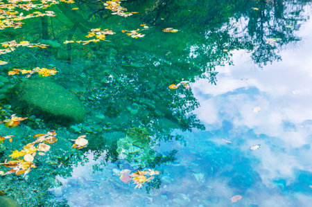 Karst blue lake high in the mountains. The depth of the karst lake Cerik-Kel is 279 meters. View of the mountain lake and mountains in autumn. Fallen leaves from trees float in the