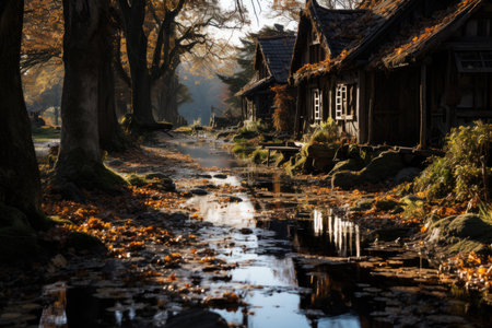 Autonal cabin surrounded by gold, stream and fallen leaves., generative AI