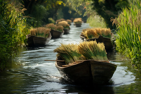 Generative AI Image of Harvested Rice on Wooden Boat at River Lake for Festive Wallpaper