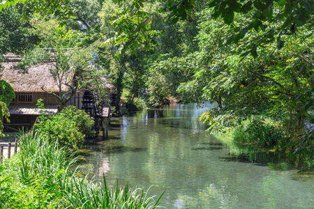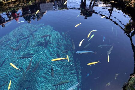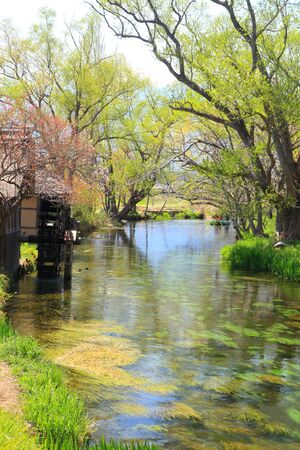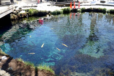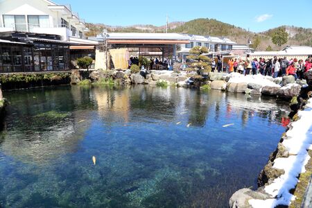 Oshino Hakkai, Japan - April 11, 2019: The very clear and beatiful pond in the Oshino Hakkai village is loacated between Kawaguchiko lake and Yamanakako lake.