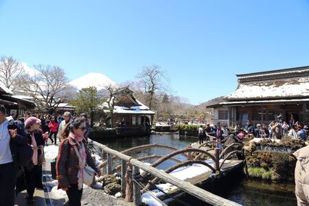 Tokyo; Japan - March 28; 2019: Tourists are viewing beautiful Mount Fuji in Oshino Hakkai Village.