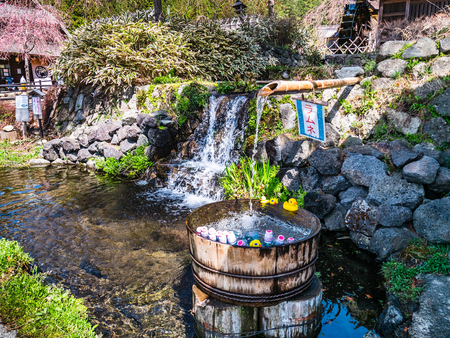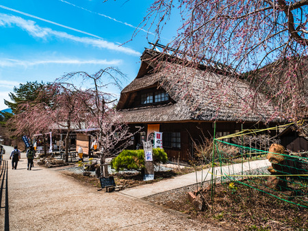 Yamanashi, Japan - April 20, 2017 : Saiko Iyashino-Sato Nenba ancient japanese village is a reconstructed Japanese village where visitors can explore In each individual building, enjoy traditional craft making activities.