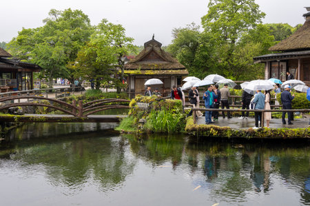 Kawaguchiko, Japan- 16 May 2024: Tourists visit Oshino Hakkai, a small village in the Fuji Five Lake region, located between Lake Kawaguchiko and Lake Yamanakako.