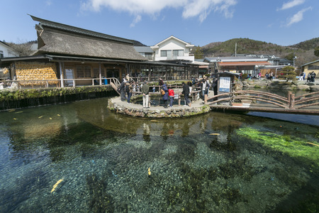 Oshino, Japan - March 27, 2016:Tourists visit Oshino Hakkai, a small village in the Fuji Five Lake region, located between Lake Kawaguchiko and Lake Yamanakako.