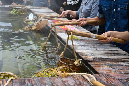 Yilan, Taiwan-NOV 14, 2020: People use boiling water to cook food in Qingshui Geothermal Park.