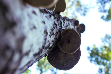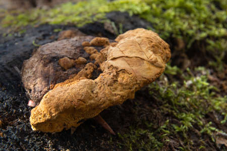 Parasitic mushroom fungi organic grow on the bark of tree wood in humid dark forest
