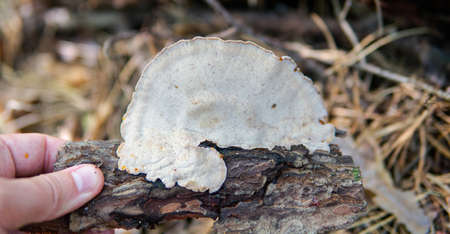 detail of polypore mushroom growing on a tree trunk during autumn season