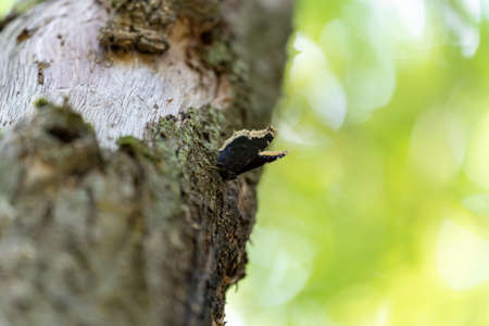 Black butterfly in the afternoon with folded wings on the bark of a tree, strong background blur