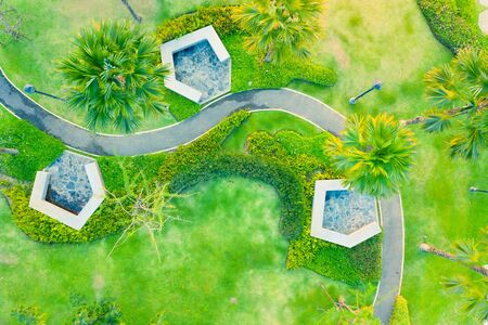 Aerial view of beautiful tropical garden. Top view of pathway in the park.